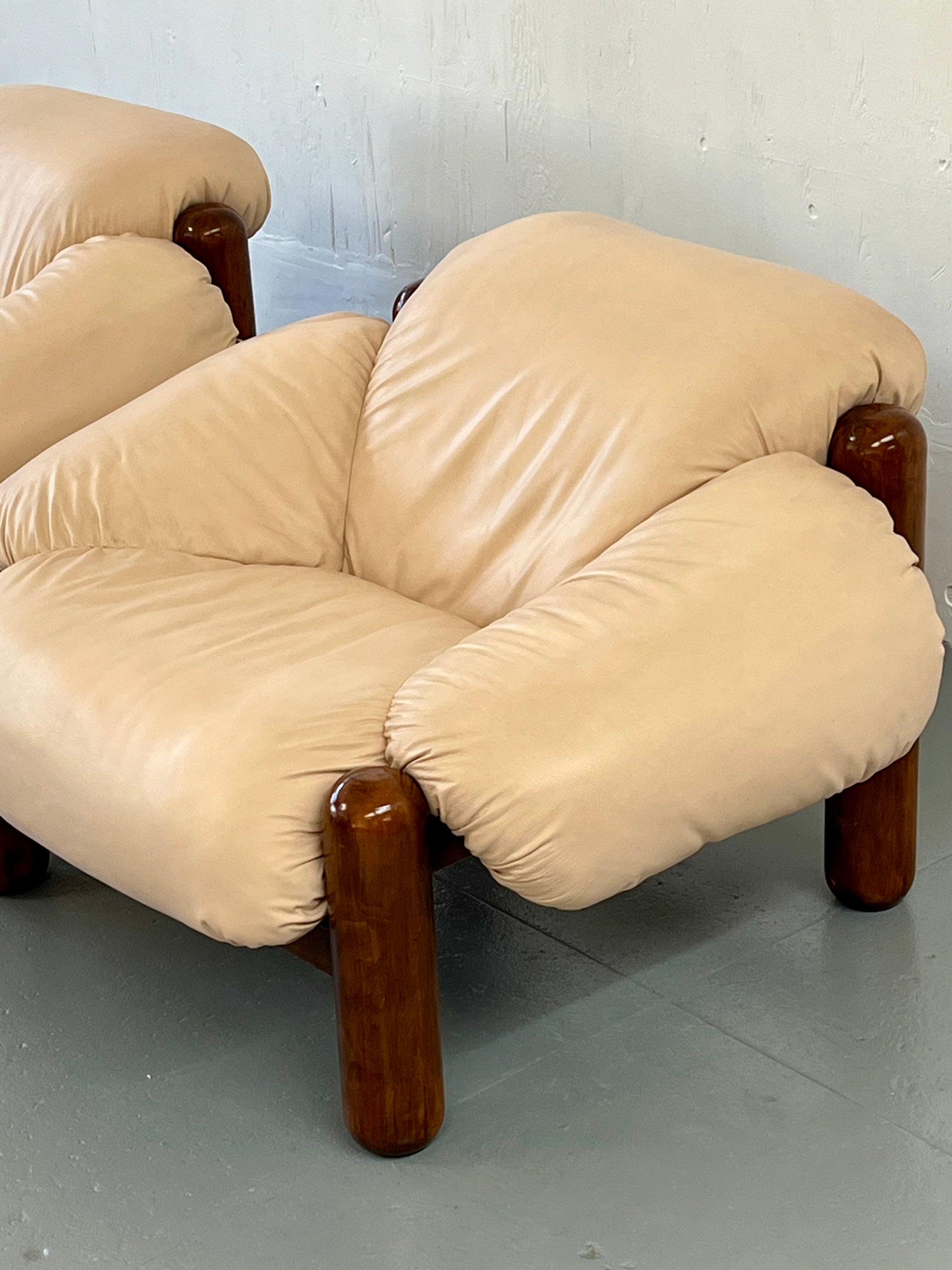 Collectible pair of large Brutalist Italian armchairs in Ivory leather by Gruppo Dam.